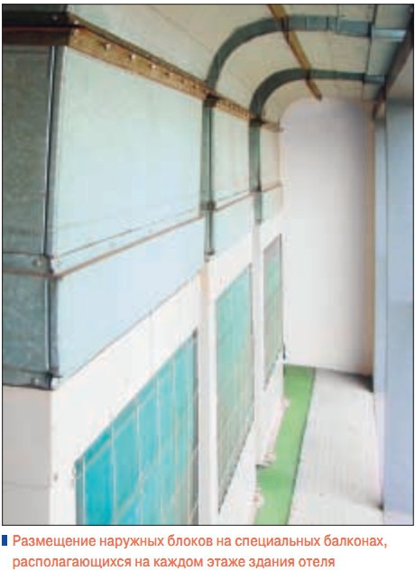 Многозональность (функциональное преимущество) дает пользователю свободу выбора внутренних климатических параметров помещения. Каждый человек— индивидуальность, в т.ч. с точки зрения систем кондиционирования воздуха. Применение ≪усредненных значений≫ неизбежно приводит ккомфорту только части людей в помещении. Другая часть, зачастую большая, будет недовольна воздухом в помещениях при его кондиционировании однозональной системой [1].Схема системы кондиционирования, реализованная в отеле RITZ CARLTON, является поэтажной, т.е. отдельный модуль системы кондиционирования обслуживает только один этаж. Благодаря этому удалось уйти от коллекторных воздуховодов и потери полезной площади здания. Размещение наружных блоков, обслуживающих один этаж, производится на специальных балконах. Фактически для оборудования класса VRF такое решение является идеальным, т.к.нет перепада высоты между внутренними и наружным блоком, следовательно нет проблем с возвратом масла в наружный блок. Для удаления теплого воздуха применяется Г-образный воздуховод в верхней части наружных блоков.