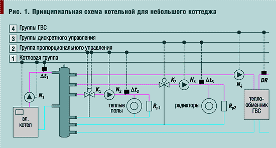 Третья зона — это автоматизация управления температурой воздуха по помещениям. Тут все понятно, в каждом помещении задается температура, и автоматика ее поддерживает. В этой статье я хочу рассказать об автоматизации второй зоны. Про первую и третью расскажу в следующих номерах журнала. Итак, перед вами принципиальная схема небольшой котельной для коттеджа — см. рис. 1. В качестве теплогенератора временно используется электрический котел, пока не подведут газ. Контуров всего три: теплые полы, радиаторы и ГВС. Управляет все этим изготавливаемый нами погодозависимый контроллер.
