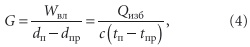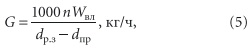 где Wвл — суммарное количество влаги, выделяемой в помещение, кг/ч; dпр — влагосодержание приточного воздуха,г/кг; dп — влагосодержание воздуха в помещении, г/кг; Qизб — количество избыточного тепла в помещении, кДж/ч;C — весовая теплоемкость воздуха, кДж/(кг⋅°C); tп — температура воздуха в помещении, °C; tпр — температура приточного воздуха, °C. Кондиционирование воздуха обусловлено необходимостью сохранять неизменными tп и dп при вероятных изменениях Wвл и Qизб. Поддерживая постоянным количество вводимого в помещение воздуха, приходится непрерывно менять величины dпр и tпр. Количество воздуха G, поступающего в рабочую зону с выделением влаги, составляет