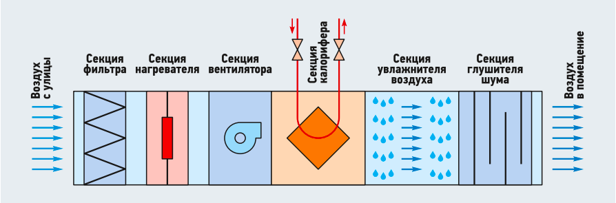 Пройдя центробежный вентилятор воздух попадает в подогреватель второй ступени — калорифер, теплообменное устройство типа «вода — воздух». Для предотвращения обмерзания теплообменного аппарата используется автоматический контроль температуры приточного воздуха после фильтра. Регулировка температуры воздуха после калорифера выполняется посредством изменения расхода теплоносителя из сети теплоснабжения на калорифер в зависимости от сигналов датчиков измерения температуры воздуха. Следующая секция увлажнения требует применения двух датчиков влажности — до и после секции, регулирование увлажнённости воздуха происходит за счёт изменения расхода воды в увлажнителе. Последний этап подготовки воздуха — снижение уровня шума с учётом восприятия звуком человека. Мониторинг производится за счёт установки шумомеров на выходе после глушителя.