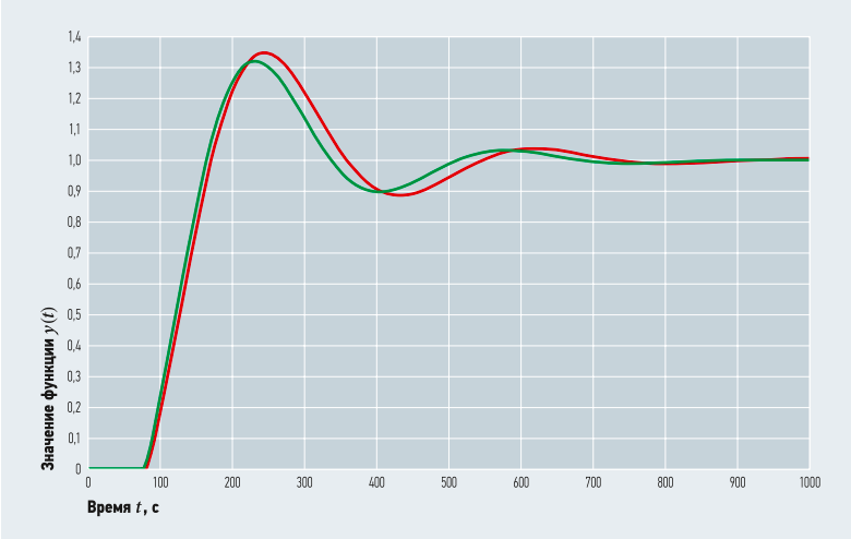 Отклик системы при изменении частоты входного сигнала приведён на годографе коэффициент частотной характеристики (КЧХ) объекта управления (рис. 2). Переходные процессы в системах с цифровым и аналоговым регуляторами при изменении задания в программе SimInTech приведены на рис. 3. Проведённый анализ современного состояния систем регулирования температуры воздуха в тепломассообменном оборудовании показал, что наиболее эффективными являются системы с качественным и количественно-качественным регулированием.
