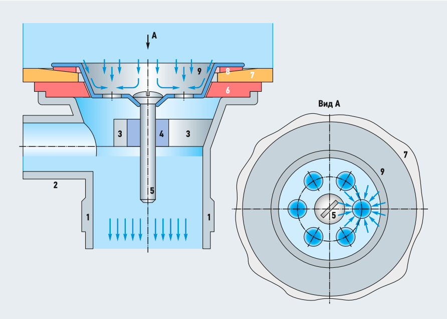 Рис. 2. Конструктивная схема современного выпуска водосливного устройства с защитной решёткой (1 — корпус отвода со штуцером перелива; 2 — штуцер перелива; 3 — кронштейн; 4 — гайка; 5 — крепёжный винт; 6 и 8 — уплотнительные прокладки; 7 — дно чаши; 9 — решётка выпуска)