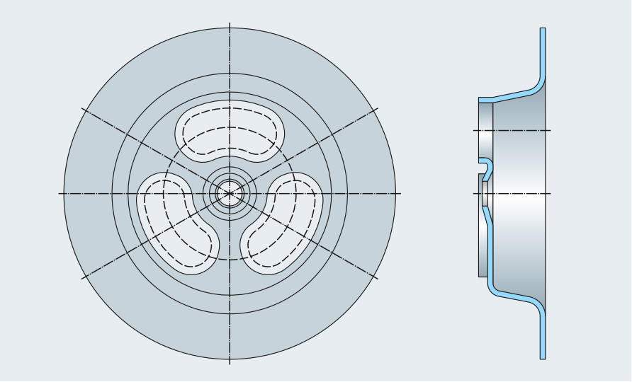 Эскиз такой защитной решётки приведён на рис. 3. От широко используемых подобного типа решёток эта отличается только тем, что в ней выполнены вместо шести круглых отверстий всего три отверстия С-образной формы, а края этих отверстий отогнуты вниз. Последнее существенно увеличивает осевую жёсткость решётки, которая крепится в корпусе сифона винтом. Этот винт может прогнуть или даже разрушить решётку. Кроме того, толщина листа, из которого формируется чаша защитной решётки, равна не 0,5, а 0,8 мм. У такой решётки по сравнению с существующими значительно уменьшено гидравлическое сопротивление и обеспечена удовлетворительная осевая жёсткость её дна.