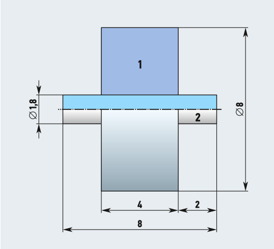 В результате, после ряда опытов, конструкция искусственного загрязнителя была подкорректирована и получилась сравнительно удачной. Окончательный вариант ИЗ приведён на рис. 4. Здесь цифрами обозначены: 1 — тело ИЗ, вырезанное из автомобильной камеры толщиной 4 мм. В его центре выполнено сквозное отверстие диаметром 1,2 мм. В это отверстие плотно вставляется медный стержень 2 диаметром 1,8 мм, как показано на рис. 4. Этот стержень улучшает весовые качества резины и не позволяет ей прилипать к стенкам каналов.