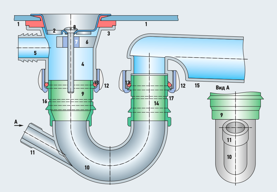 Рис. 5. Конструктивная схема универсального самоочищающегося пластмассового водосливного устройства с гидрозатвором (1 — дно чаши; 2 — решётка выпуска; 3 — комбинированное эластичное уплотнение выпуска; 4 — корпус выпуска; 5 — штуцер перелива; 6 — кронштейн; 7 — гайка; 8 — крепёжный винт; 9 — втулка выпуска; 10 — корпус гидрозатвора; 11 — штуцер для подвода воды для очистки гидрозатвора; 12 — накидные гайки; 13 — эластичные уплотнения; 14 — втулка отвода; 15 — труба отвода; 16 и 17 — круговые проточки)