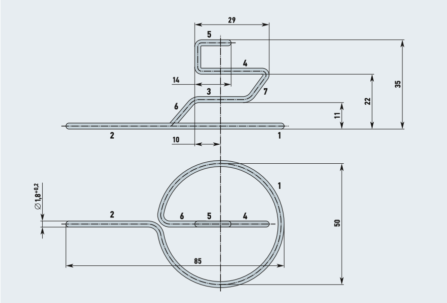 Приспособление для экспериментального определения пропускной способности сифона было выполнено из отрезка медной проволоки диаметром 1,8 мм. Его основными элементами являются основание 1 с направляющей 2, фиксатор 3 нижнего уровня воды, фиксатор 4 верхнего уровня и фиксатор 5 заполнения максимального уровня воды перед определением пропускной способности сифона. Наклонные участки 6 и 7 нужны для того, чтобы при изготовлении было бы легко обеспечить требуемую высоту фиксаторов 3 и 4 над дном чаши, в которую вмонтирован исследуемый сифон.