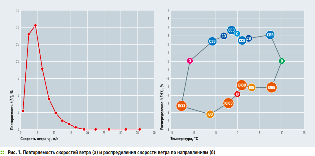 Также в программе были построены графики повторяемости скоростей ветра и распределения скорости ветра по направлениям для оценки ветроэнергетического потенциала исследуемой площадки (рис. 1). По полученным данным можно сделать вывод, что территория является благоприятной для размещения ветроэнергетических установок.