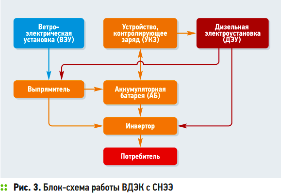 Разработанная система работает следующим образом (рис. 3): электроэнергия, которая вырабатывается ВЭУ, идёт на покрытие нагрузки потребителей, если её недостаточно, то в работу включается система накопления электроэнергии и выдаёт то количество электроэнергии, которое необходимо для покрытия нагрузки. При недостаточном заряде или при достижении 20% от номинала СНЭЭ устройство, контролирующее заряд (УКЗ), подаёт сигнал на дизельную электростанцию, и та, в свою очередь, вырабатывает необходимое количество электроэнергии для покрытия потребления. Если ВЭУ вырабатывает избыточное количество электроэнергии, то излишек отходит на заряд системы накопления через выпрямитель. Также ДЭС при работе в режиме «горячего резерва» (не выдаёт энергию потребителю) вырабатывает электроэнергию, которая идёт на заряд СНЭЭ. Таким образом, система функционирует надёжно и эффективно, в максимальной степени используя ветровой ресурс и экономя дорогостоящее дизельное топливо.