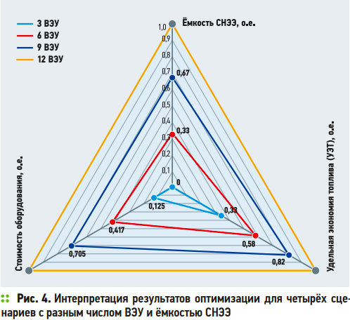 Тем не менее, при наличии хотя бы шести ВЭУ и системы накопления электроэнергии ёмкостью 5000 кВт·ч удельная экономия топлива достигает 0,58 о.е., что на три относительных единицы больше, чем в комплексе без СНЭЭ. Наибольший прирост величины УЭТ наблюдается при увеличении мощности ВЭС, что логично, так как бóльшая выработка требует накопления энергии в определённые моменты времени, когда нагрузка минимальна. Однако стоит отметить, что использование СНЭЭ ёмкостью 10 тыс. и 15 тыс. кВт·ч нецелесообразно, так как это делает строительство более капиталоёмким, но не даёт значительного прироста по экономии топлива. На рис. 4 приведена графическая интерпретация результатов оптимизации для четырёх сценариев с разным числом ветроустановок и ёмкостью системы накопления (выделены в табл. 1).
