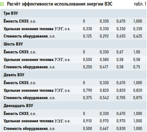 Результаты расчёта исследуемой системы оценены по двум показателям, выраженным в относительных единицах: удельной экономии топлива (УЭТ), рассчитанной по формуле (11), и удельной стоимости строительства самых капиталоёмких частей комплекса, а именно ВЭУ и СНЭЭ: