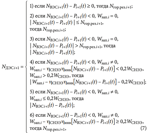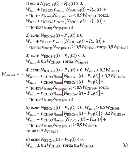 где NВЭСi+1(t) — выработка электроэнергии ВЭС за (i + 1)-й час, кВт·ч; Pi+1(t) — нагрузка за (i + 1)-й час, кВт·ч; Wзап.i — запасённая энергия в i-м часу, кВт·ч; ηСНЭЭ — КПД СНЭЭ; ηвыпр — КПД выпрямителя; Nгор.рез.i+1 — выработка в режиме горячего резерва ДЭС за (i + 1)-й час, кВт·ч; WСНЭЭ — полная мощность СНЭЭ, кВт·ч; ηинв — КПД инвертора.