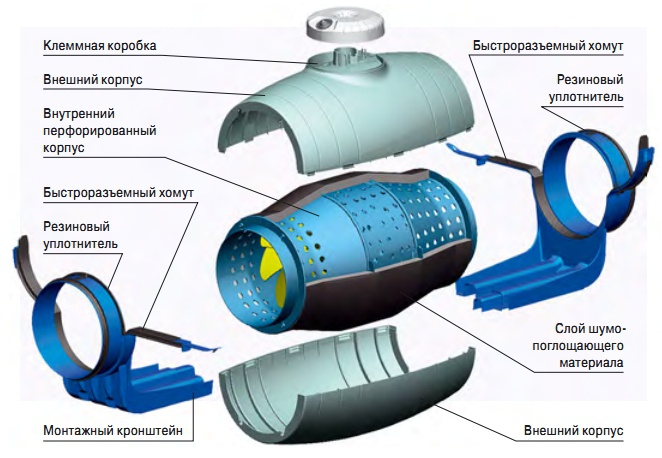 Внутренний перфорированный корпус пропускает звуковые волны, направляя их под определенным углом на слой шумопоглощающего материала, в котором звуковые волны гасятся практически на 100 %.Передаче вибраций от корпуса вентилятора на воздуховод препятствуют специальные быстроразъемные хомуты с резиновыми уплотнителями. Вентиляторы TDSilent изготавливаются из высококачественного пластика.