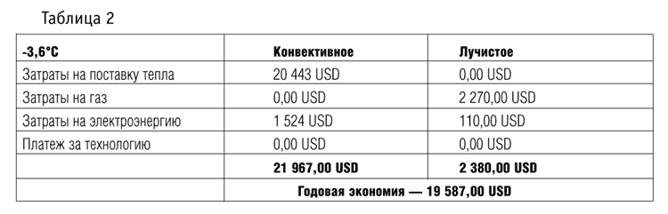Были определены все компоненты системы лучистого отопления, их стоимость, включая монтажные и наладочные работы, т.е. сдачу системы в эксплуатацию «под ключ». Общая стоимость составила 49 120 USD. Также были проведены расчеты реальных финансовых затрат на реконструкцию существующей отопительной системы на лучистое отопление с определением эффективности ее реализации. Сравнение реальных годовых затрат на конвективное и лучистое отопление (табл. 2)