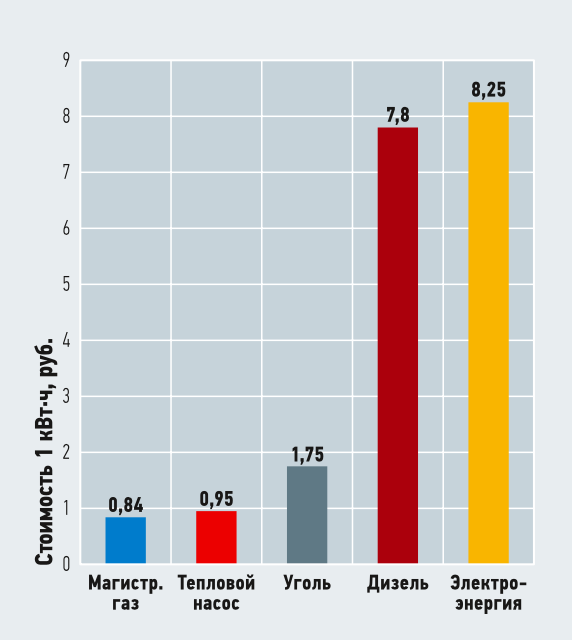 Тепловые насосы относятся к числу наиболее экономичных устройств в климатической технике по эксплуатационным затратам. Сравнение стоимости 1 кВт·ч полезного тепла при различных вариантах теплоснабжения показывает, что по уровню расходов теплонасосные установки, как правило, уступают только магистральному газу (рис. 2).