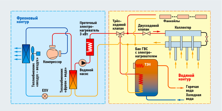 Как правило, он включает циркуляционный насос, пластинчатый теплообменник «хладагент — вода», расширительный бак, предохранительный клапан и систему трубных датчиков.