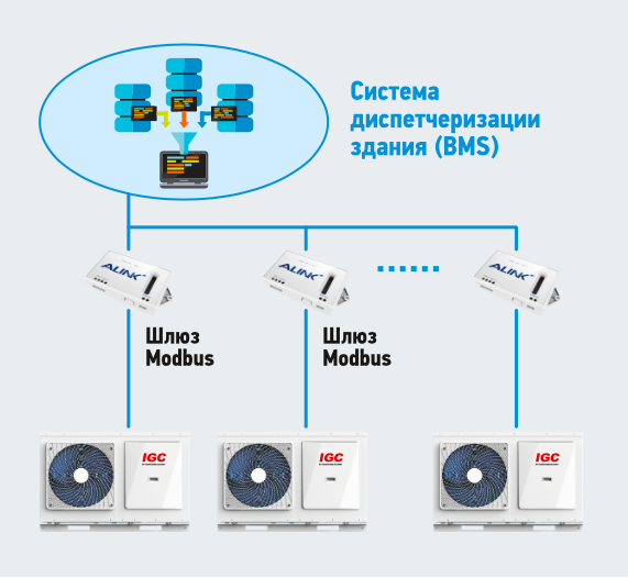 При необходимости группа тепловых насосов может быть интегрирована в систему диспетчеризации здания (BMS) и управляться по Modbus RTU (рис. 4). Для этого требуется опциональный шлюз (как правило, отдельно для каждого блока).
