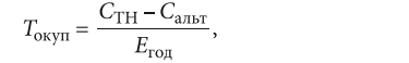 где CТН — стоимость теплового насоса с учётом монтажа; Cальт — стоимость альтернативного оборудования (электрокотёл, дизельный или твёрдотопливный котлы); Eгод — разница в стоимости отопления за год (затраты на газ/дрова/электричество) минус затраты на электроэнергию для работы ТН с учётом его SCOP.