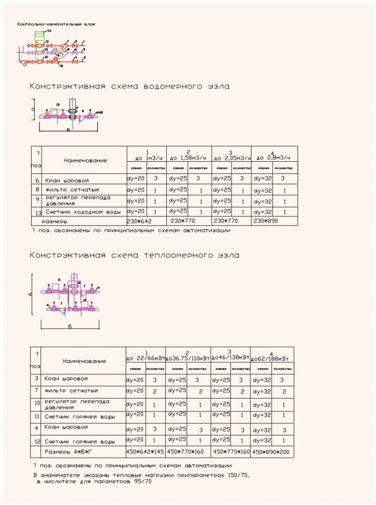 Этот расход теплоносителя принимаем за максимальный и по нему определяем тепловую нагрузку теплосчетчика в зависимости от температур теплоносителя в расчетный период. Водомер подбираем из условия обеспечения водой как системы холодного водоснабжения, так и системы ГВС. При этом сопротивление водомера не должно превышать 1 м вод. ст. При указанных ограничениях узлы учета могут комплектоваться — см. табл. 2.