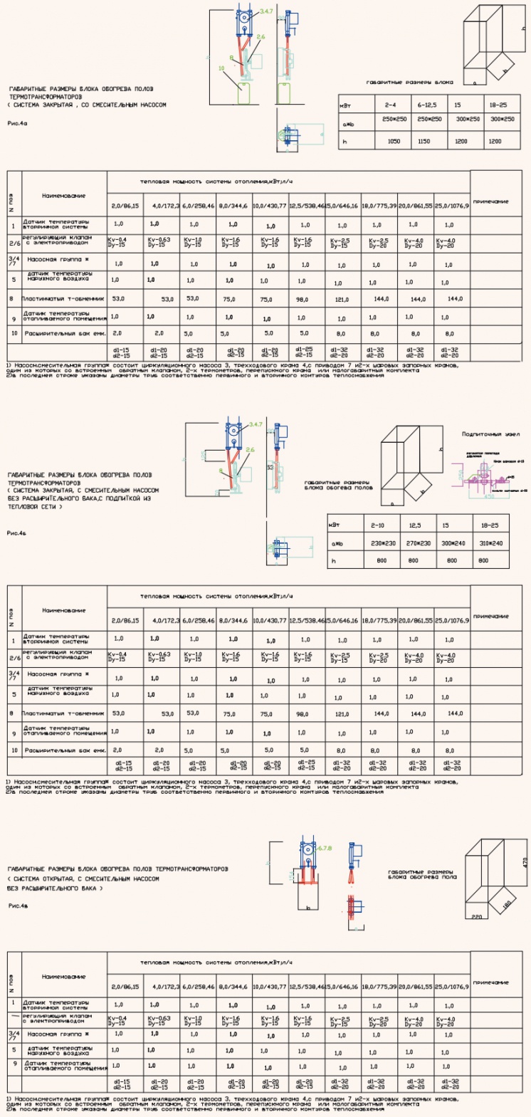 Поэтому, как правило, эти блоки желательно выполнять с смесительным насосом. На рис. 4, а представлены габаритные размеры, компановка и основное комплектующее оборудование для закрытой системы. На рис. 4, б приведена информация для закрытой системы, но с системой подпитки вторичного контура из сети первичного контура. Открытая система теплоснабжения вторичного контура блока напольного отопления изображена на рис. 4, в.