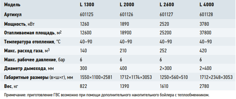 Подвод газа от DN25 до DN50, присоединение отопления от G2ʺ до DN125, диаметр дымохода от 150 до 400 мм. Для двухсекционных моделей (2520 кВт) предусмотрены два входа и два выхода.