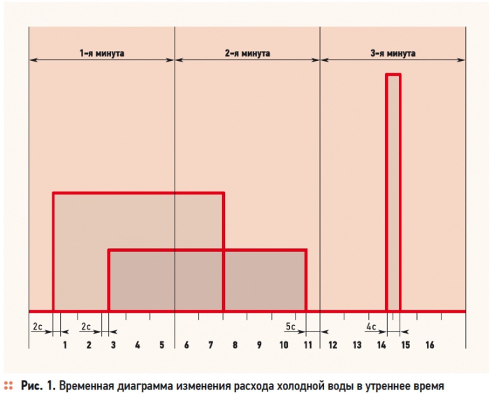 На рис. 1 упрощенно показана временная диаграмма изменения расхода холодной воды в утреннее время; по горизонтальной оси отложены 10секундные интервалы от 1 до 15 на базе примерно 2,5 минут. Потребителем является обычный «средний» студент, рабочий или служащий: после подъема и посещения туалета сливной бачок с 1го по 8й 10секундные интервалы заполняется снова; далее, с 4го по 12й интервалы — умывание, здесь возможно смешивание холодной и горячей воды, но мы показываем только холодную; наконец, в районе 15й метки — кратковременное наполнение водой сосуда для заварки кофе или чая; мытье посуды не рассматриваем, считаем, что оно производится горячей водой. Получилось, что за трехминутный интервал расход изменился скачком шесть раз. Для простоты считаем скорости истечения воды на каждом интервале постоянными.