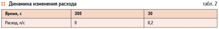 Для апробирования адаптивного и Feed Forward алгоритмов наряду с алгоритмами, заложенными в теплосчетчики фирм Enernet, Kamstrup, ABB, Siemens и Actaris Шведская ассоциация централизованного теплоснабжения (Swedish District Heating Association) решила провести ряд экспериментов в условиях динамического изменения тепловой нагрузки. Адаптивный и Feed Forward алгоритмы были реализованы в пакетах MATLAB & Simulink. Один из наиболее интересных экспериментов предусматривал только изменение расхода ГВС, не включая тепло. Динамика процесса представлена в табл. 2.