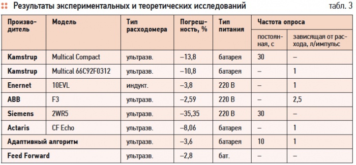 Результаты моделирования с использованием адаптивного алгоритма и алгоритма Feed Forward, а также результаты проведения реальных экспериментов по эффективности теплосчетчиков крупных мировых производителей (в условиях динамических нагрузок) сведены в табл. 3. Как видно из таблицы, даже приборам весьма именитых разработчиков свойственно иметь большие погрешности измерения в динамическом режиме эксплуатации. Если не брать в расчет модель Siemens 2WR5, где слишком большая погрешность, очевидно, вызвана неким сбоем в работе, то батарейные приборы выглядят несколько хуже сетевых. Одна из причин — низкая частота опроса и несовершенство алгоритма обработки первичных данных. Это лишний раз подчеркивают графики изменения погрешности измерения тепла во времени, представленные в работе [6].