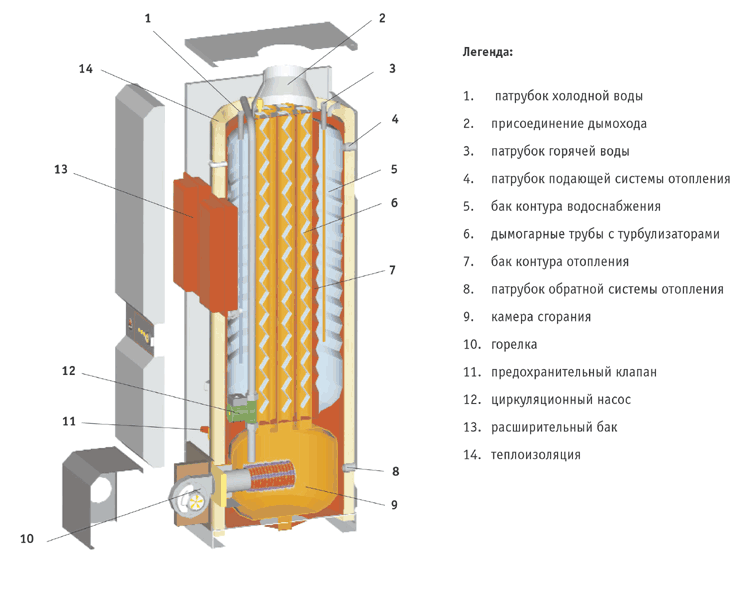 В вертикальном направлении через емкости проходит пучок дымогарных труб, оснащенных турбулизаторами. Внутренний бак отделен от дымогарных труб теплоносителем, содержащимся в наружном баке. Теплоноситель омывает камеру сгорания, дымогарные трубы и через стенки внутреннего бака отдает тепло в контур санитарной воды. Для интенсификации процесса теплообмена в контуре с промежуточным теплоносителем установлен циркуляционный насос. Он принудительно подает теплоноситель из верхней части котла в нижнюю.
