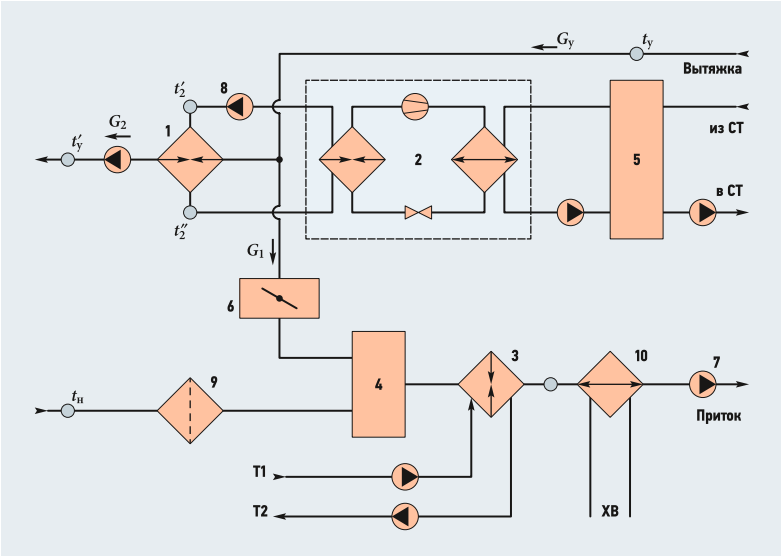 Рис. 1. Схема утилизации теплоты вытяжного воздуха при помощи теплонасосной установки (1 — теплообменник-утилизатор; 2 — тепловой насос типа «антифриз — вода»; 3 — калорифер подогрева наружного воздуха; 4 — камера смешения; 5 — бак-аккумулятор; 6 — воздушная регулирующая заслонка; 7 — приточный вентилятор; 8 — циркуляционный насос; 9 — воздушный фильтр; 10 — воздухоохладитель)
