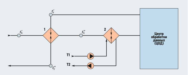 Чтобы утилизировать сбросную теплоту ЦОД, необходимо использование теплообменного аппарата, который встраивается в вытяжной воздуховод системы вентиляции дата-центра. Теплота от вытяжного воздуха с помощью промежуточного теплоносителя (антифриза) передаётся испарителю теплового насоса.