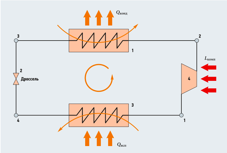 Рис. 3. Принципиальная схема теплового насоса (1 — конденсатор; 2 — дроссель; 3 — испаритель; 4 — компрессор)