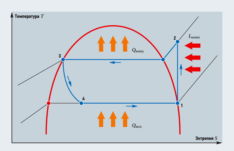 Точка 1 — состояние сухого насыщенного пара, который образуется после полного испарения жидкого хладагента в испарителе. После этого происходит сжатие хладагента в компрессоре с резким повышением давления, представленным на диаграмме процессом 1–2. Перегретый пар (точка 2) подаётся в конденсатор, где он охлаждается до сухого насыщенного состояния, а затем полностью конденсируется (точка 3), отдавая тепловую энергию. Затем хладагент в жидком состоянии проходит через дросселирующее устройство, где его давление и температура понижаются (процесс 3–4). Процесс 3–4 является изоэнтальпийным, так как он проходит практически адиабатно. В процессе 4–1 происходит кипение хладагента в испарителе, он получает теплоту низкопотенциального источника [6].