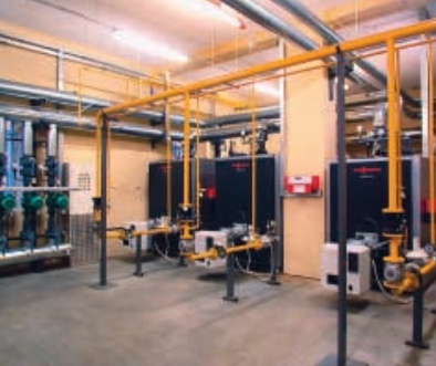 Для котельных мощностью более 3,5 МВт предусматривается активная система подогрева холодного воздуха.Созданные фирмой VIESSMANN низкотемпературные котлы работают в режиме погодозависимой теплогенерации,имеют трехходовую систему прохождения дымовых газов. Они обладают теплоаккумулирующей способностью (уменьшением частоты стартов горелки), что способствует достижению высокого КПД — до 95%— и снижению эмиссии загрязнений (CO и NOX).