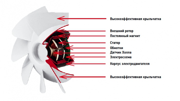Подобные электродвигатели обладают многочисленными преимуществами перед асинхронными электродвигателями переменного тока, такими как: повышенная надежность (заводская гарантия на вентиляторы серии TD составляет 5 лет); широкий диапазон регулирования скорости вращения (линейно от 10 до 100 %); встроенная защита электродвигателя от перегрева, короткого замыкания, заклинивания ротора; меньшими тепловыделениями и высокой эффективностью.