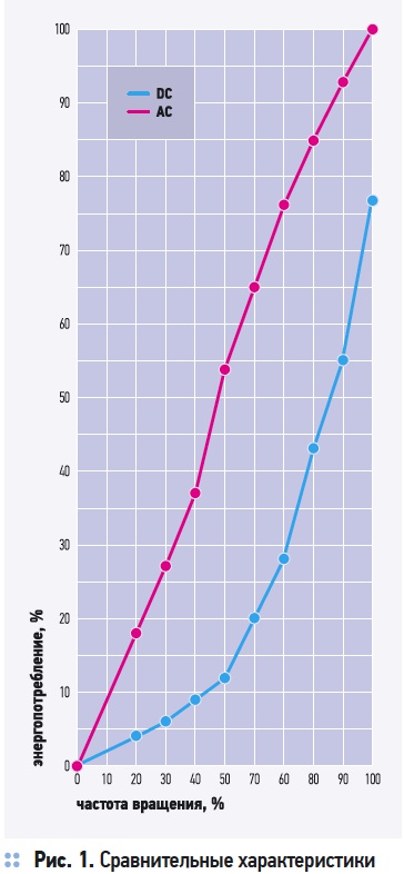 На рис. 1 приведены сравнительные характеристики вентилятора с двигателем постоянного тока и с асинхронным двигателем переменного тока.