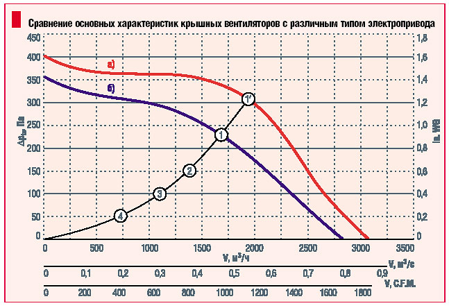 Ниже приведено сравнение основных характеристик (~2~ 1) и соответствующее энергопотребление (табл. 1 ~3~) крышных вентиляторов модели DV 355-4 с разными типами электродвигателя: