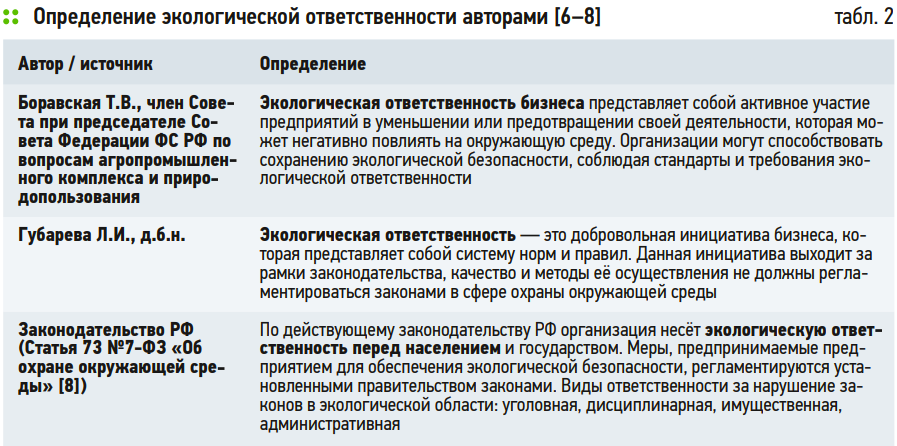 Экологическая ответственность является одним из ключевых элементов социальных корпоративных норм и тесно переплетена с этическими требованиями делового сообщества. Государство, бизнес-сектор и частные лица несут полную ответственность перед другими участниками общества. По причине того, что компании, независимо от размера, могут оказывать существенное воздействие на окружающую среду, становится необходимым проанализировать роль экологической ответственности в российском законодательстве, а также рассмотреть трактовку экологической ответственности экспертами данной области (табл. 2).