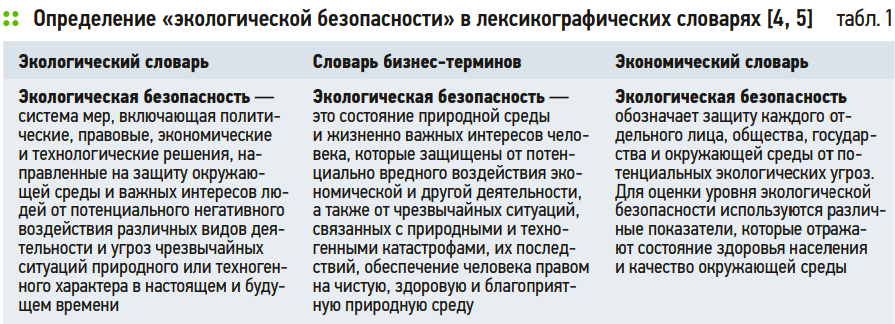 В настоящее время наблюдается повышенная значимость «экологической безопасности». С каждым днём угрозы для окружающей среды и человеческого здоровья возрастают из-за различных видов загрязнения, изменений климата, вырубки лесов и непоследовательного использования природных ресурсов. Для более глубокого понимания значения экологической безопасности стоит рассмотреть трактовку термина в различных лексикографических словарях (табл. 1).