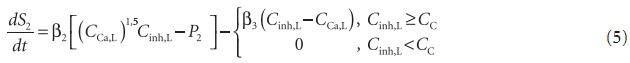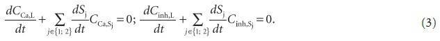 гдеβ2, β3 — коэффициент скорости роста и растворения аморфной фазы. Последний член учитывает описанную в литературе [6] возможность образования растворимого кальциевого комплекса ингибитора при их эквимольном взаимодействии, что приводит к растворению кальцийсодержащей аморфной фазы, вследствие чего при Cinh,L > CCa,L в выражении (6) решающую роль играет последний член,и знак dS2/dt всегда неположителен.