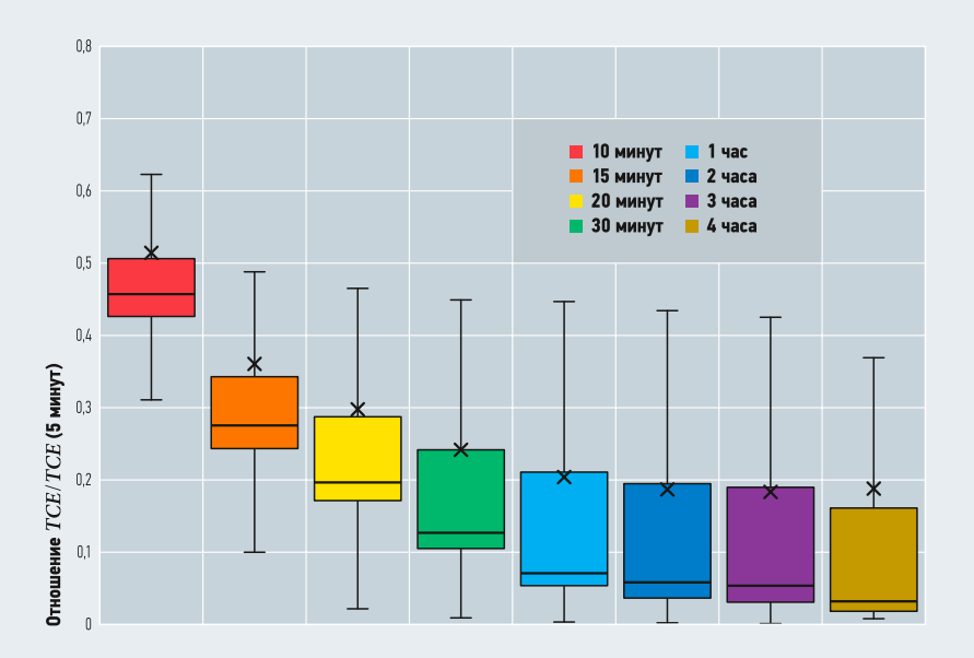 На рис. 1 показаны диаграммы полной стоимости оборудования конфигураций (TCE) для различных временных разрешений, нормированной на TCE для временного разрешения в пять минут (трёхмесячный набор данных) для станции №23005. Притом для обоих наборов данных (как для трёхмесячного, так и для годового) наблюдается тенденция к увеличению стоимости при уточнении временного разрешения метеоданных.