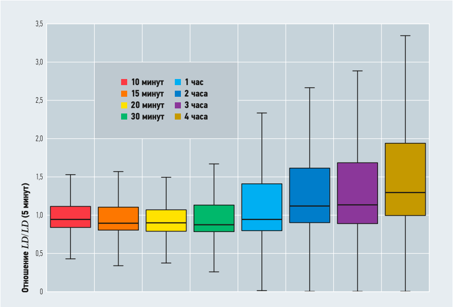 На рис. 2 показаны диаграммы наибольшей продолжительности перерыва в энергоснабжении нагрузки (LD) для различных временных разрешений, нормированной на LD для временного разрешения в пять минут для станции №23005. Наблюдаются незначительные различия между результатами, полученными при временном разрешении десять, 15, 20 и 30 минут для трёхмесячного набора данных. Однако дальнейшее уменьшение разрешения метеорологических данных (один-четыре часа для обоих наборов данных) приводит к завышению результатов LD (по сравнению с расчётом на основе данных, наиболее близких к реальным условиям). Это также приводит к последовательному увеличению разброса результатов по мере уменьшения временного разрешения. Для других метеостанций были получены аналогичные результаты, поэтому они не показаны.