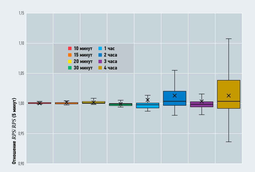 Диаграммы надёжности энергоснабжения (RPS) при различных временных разрешениях, нормированной на RPS при временном разрешении в пять минут (трёхмесячный набор данных) представлены на рис. 3 для станции №23005. Разница между результатами, полученными при временном разрешении от десяти минут до одного часа (от одного до двух часов) и полученными при пяти минутах (30 минут), находится в пределах 3% для большинства конфигураций всех трёх метеостанций для трёхмесячных наборов данных (годовых наборов данных). Примечательно, что временное разрешение в три часа позволяет более точно оценить RPS, чем разрешение в два часа для обоих наборов данных (по результатам расчётов на основе метеоданных со станции №23005). В то же время результаты расчётов по данным метеостанции №23005 демонстрируют явную тенденцию к завышению RPS при использовании метеоданных большего временного разрешения. Результаты расчётов по данным метеостанции №39352, напротив, показывают занижение. Результаты, полученные по данным станции №47647, также имеют тенденцию к занижению RPS при использовании грубого временного разрешения (за исключением временного разрешения в три часа, которое, напротив, приводит к завышению RPS).