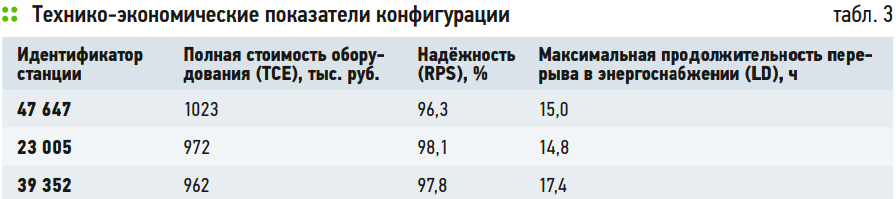 Результаты анализа эффективности одних и тех же вариантов конфигурации системы автономного электроснабжения практически не имеют зависимости от расположения метеостанции. При этом установка ВЭУ не оказалась экономически целесообразной, по причине низкой скорости ветра по данным каждой из метеостанций. Основные экономические и технические характеристики одной определённой конфигурации, близкой к оптимуму по соотношению TCE и RPS (использованы метеоданные за один год; минимально допустимая степень заряда СНЭ SoCmin = 0,2; установленная мощность СБ WСБ = 3 кВт; установленная мощность ВЭУ WВЭУ = 0 кВт; установленная ёмкость СНЭ EСустНЭ = 6 кВт·ч), для примера приведены в табл. 3.