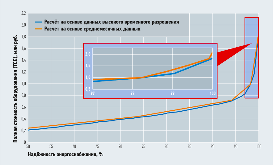 Заказчик всегда хочет, чтобы надёжность энергоснабжения была стопроцентной, иногда к этому прямо обязывают требования к особой группе потребителей первой категории, но не всегда присутствует понимание, как дорого придётся за это заплатить. Например, порядок совокупной стоимости владения автономным источником питания, относящимся к особой группе первой категории, в Ямало-Ненецком автономном округе составляет более 1 млн руб. за 1 кВт средней мощности нагрузки [5] (также см. график зависимости стоимости от надёжности в конце статьи). Нередко выясняется, что требования к надёжности вполне можно снизить, но ещё чаще получается так, что истинная надёжность (даже без поломок оборудования) и сроки службы аккумуляторных батарей (АБ) оказываются значительно ниже расчётных. Ознакомившись со сложившейся практикой, мы пришли к выводу, что значительное влияние на такие результаты оказывает временное разрешение исходных метеоданных [6–8], используемых при энергетических расчётах.