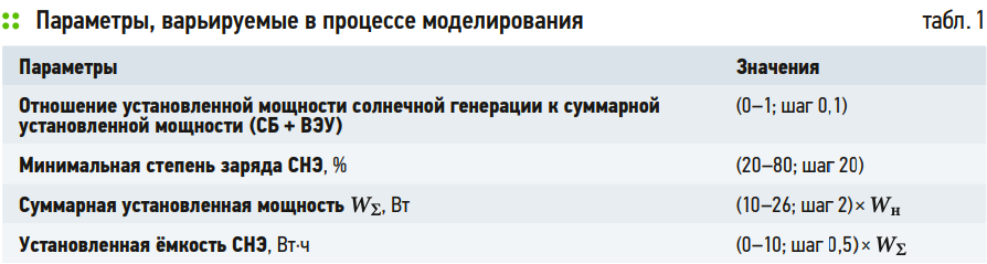 При разработке автономных энергосистем, требующих бесперебойного электроснабжения, выбор оптимальной конфигурации системы представляет собой крайне ответственную задачу. Оптимизация конфигурации энергосистемы, состоящая в выборе технических характеристик и условий эксплуатации солнечных батарей (СБ), ветроэлектрической установки (ВЭУ) и системы накопления энергии (СНЭ), также приводит к наиболее эффективному использованию оборудования [3]. Оптимизация работы СНЭ особенно важна, поскольку, как правило, стоимость жизненного цикла СНЭ составляет около 30–40% от стоимости всей автономной системы электроснабжения. Редко используемым, но эффективным способом снижения потребности в СНЭ является управление нагрузкой для её следования за выработкой энергии от ВИЭ [4].