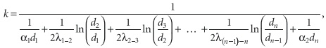 Безусловно, наиболее достоверные данные о теплоотдаче того или иного сочетания различного рода труб и теплоизоляций дает только эксперимент, но в связи с отсутствием в большом количестве случаев такого рода информации единственно возможным способом корректного учета величины теплового потока от труб является расчет. Рассмотрим методику такого расчета. Следует сразу отметить, что методика построена на использовании известных формул, тем не менее, она вносит определенные уточнения в расчеты подобного рода [2–6].Коэффициент теплопередачи трубы определятся из формулы [7]: