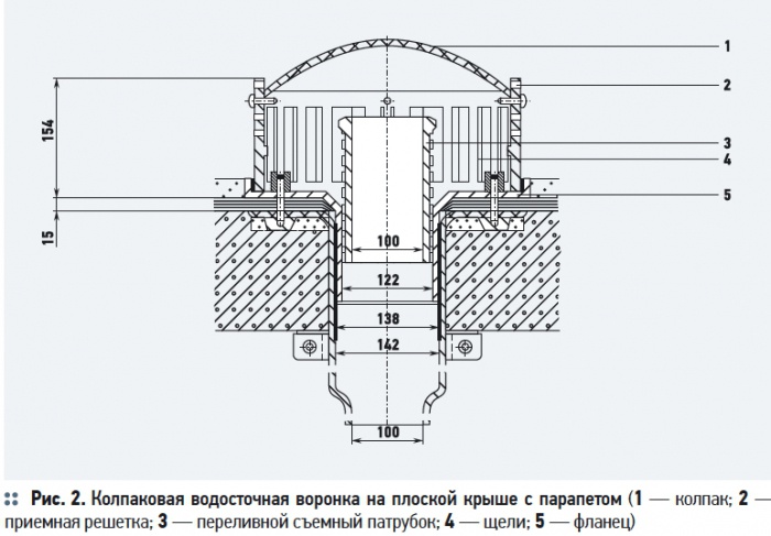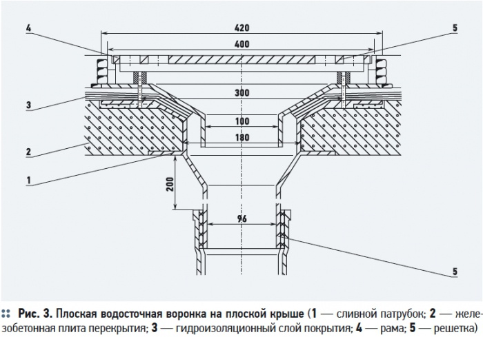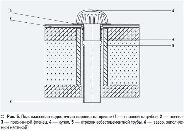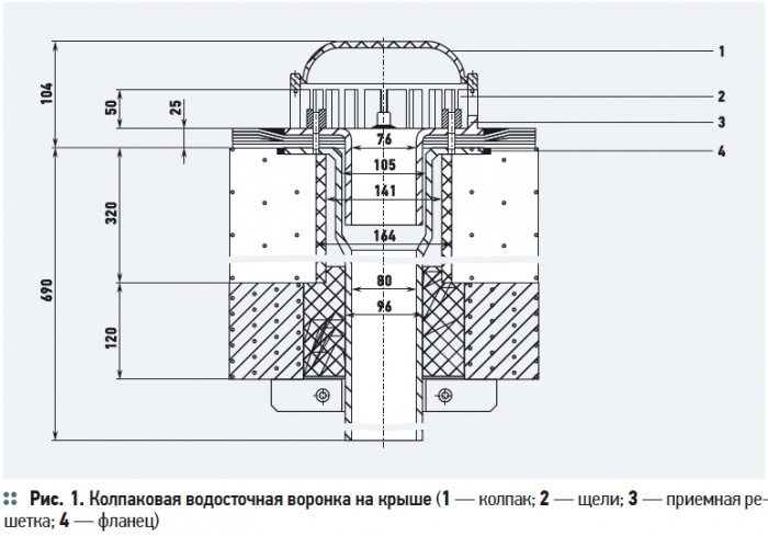 Для жилых зданий с плоской неэксплуатируемой кровлей рекомендуется [8] применять воронки типа Вр7м с условным проходом патрубка 80 мм (рис. 4).