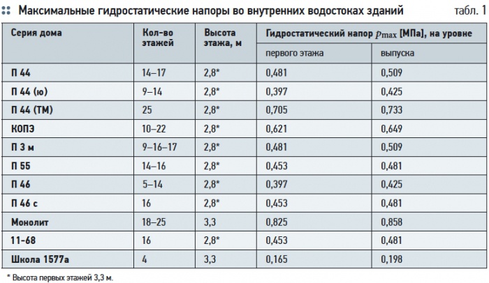 При пленочном течении водосточный трубопровод будет работать в безнапорном режиме. При напорном течении какаято часть водосточного трубопровода будет работать в напорном режиме. Стенки водосточных трубопроводов будут подвергаться воздействию внутреннего гидростатического давления pi, величина которого будет определяться высотой сечения от самой нижней точки водостока. Гидростатическое давление будет создаваться и в случае засорения внутреннего водостока, а также при проведении гидростатических испытаний после монтажа. Сечения, которые будут подвергаться воздействию наибольших значений гидростатического давления, будут находиться в водосточных выпусках. Подсчитанные с известными допущениями максимальные значения внутренних гидростатических давлений для сечений внутренних водостоков на уровне первого этажа и гидрозатворов домов типовых московских серий представлены в табл. 1.