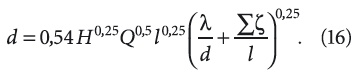 После совместных преобразований (10)—(15) и замены скорости V на расход Q с использованием уравнения неразрывности струи в сплошном потоке была получена расчетная формула для определения расчетного диаметра внутренних водостоков, работающих в напорном режиме, в виде: