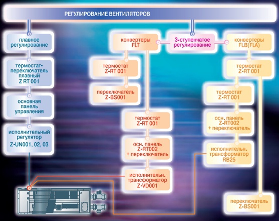 Отопительные приборы должны регулироваться по своей теплоотдаче, в зависимости от требований к помещению и изменению внешних условий. Теплоотдачу можно регулировать различными способами, но в основе лежат два принципа: изменение количества (объема) проходящего теплоносителя и изменение режима работы вентиляторов. Для приборов с принудительной конвекцией применяются оба принципа.